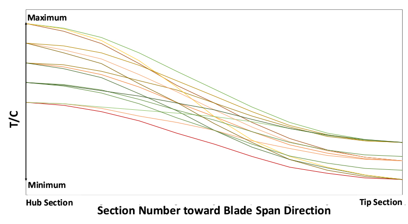- The flow generated from the inlet to the outlet by the rotation of the compressor rotor and blades induces vibrations as it passes through the stationary vanes. The rotation of the rotor and the number of vanes and their difference are the sources of excitation that induce the vibration of the blades. Resonance avoidance design is the process of adjusting the mass and stiffness to prevent the natural frequencies of the excitation sources and the blade from intersecting. It is generally performed after evaluating aerodynamic performance. Therefore, design variables that can change the natural frequency of the blade while minimizing changes in aerodynamic performance are utilized, and the most representative is the thickness distribution ratio of the blade cross-section. In this study, Static structure and modal analysis were performed on blade shapes with various thickness-to-chord length ratio in each section in the span direction of the blade. The influence of the thickness over chord length ratio on each major vibration mode was analyzed by applying the stepwise regression analysis method, and the linear regression equation for predicting the frequency of each major mode was derived and applied to the resonance avoidance design. In addition, the frequency using the regression equation and the frequency of the modal analysis results were compared to validate the proposed resonance avoidance design method.