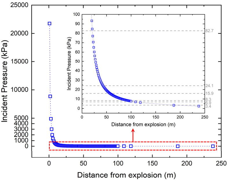 - This study quantitatively assessed the risks of solid rocket motor firing tests by calculating and analyzing safety distances. For HD 1.3, the safety distances for ILD were 28% to 65% shorter, and those for PTRD and IBD were 61% and 76% shorter, respectively, compared to HD 1.1. Both Dmax and Dmin, the international launch site safety standards, were found to be longer than the calculated safety distances for both HD 1.3 and HD 1.1. Damage assessments based on safety distances indicated that there were no fatalities among personnel for either HD 1.3 or HD 1.1, although risks of eardrum rupture were identified. No injuries or fatalities occurred at Dmax and Dmin distances. However, glass windows in the test facilities showed critical vulnerability at all safety distances for both HD 1.3 and HD 1.1, including Dmin.