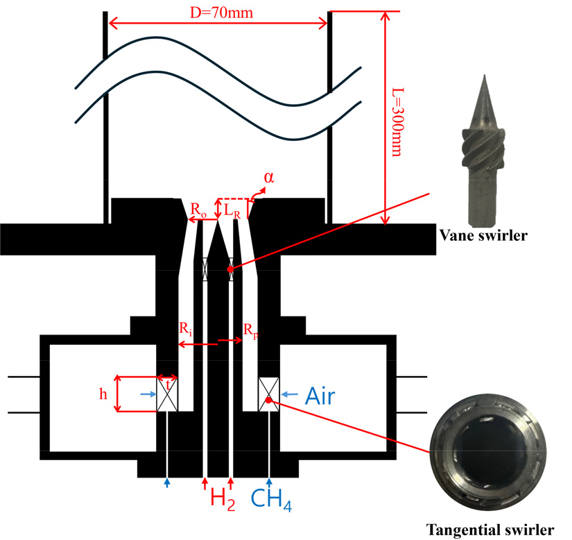 - A study was conducted on flame behavior and NOx emission characteristics in co-axial counter-swirl injector for gas turbine engine under various inner swirl levels and quarl angles. The study was carried out with a fixed total heat release rate of 5 kW, using global equivalence ratio, hydrogen co-firing ratio, quarl angle, and inner swirl number as key parameters. Five distinct flame shapes were identified based on the global equivalence ratio and hydrogen co-firing ratio. It was observed that the inner swirl number and quarl angle influence the mixing performance between the premixed methane-oxidizer flow through the outer nozzle and the hydrogen flow from the inner nozzle, as well as the recirculation zone, leading to variations in flame behavior and NOx emissions.